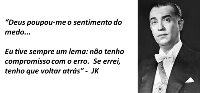 “JK foi um estadista na melhor dimensão do termo, ao conceber um projeto de longo prazo para o país e ao ser capaz de mobilizar sua geração para implementá-lo. Ele vislumbrava um país moderno, industrializado, culturalmente relevante … A socióloga e cientista política Lourdes Sola, em seu livro Ideias Econômicas, Decisões Políticas, diz que a estratégia de gestão política de JK é um nítido exemplo do seu estilo conciliador e solucionador de problemas. O Estado, sob seu comando, assumiu um papel de articulador de incentivos e não de monopolizador de decisões … Acrescente-se a coragem. Em momento crucial de sua vida política, em que era preciso ser firme diante do embate que se aproximava, ele disse: ‘Deus poupou-me o sentimento do medo’. A frase mobilizou aliados e bastaria para assegurar-lhe um lugar na história ”.